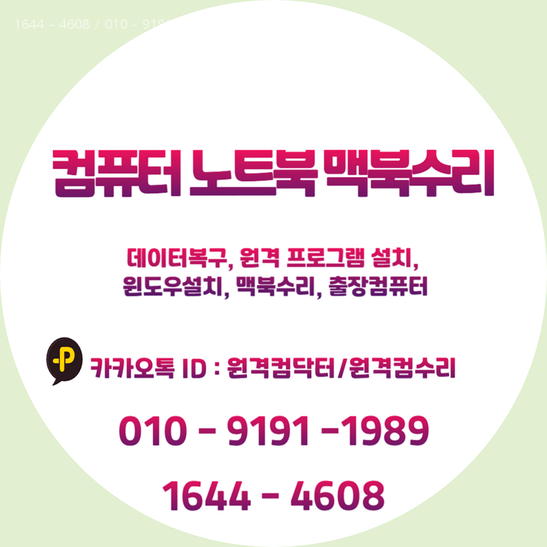 문의 상담전화 및 문자: 010-9191-1989카카오채널 ID: 원격컴수리 저희는 전화, 문자, 카카오톡으로 접수를 받고 있습니다. 지금 바로 문의하세요! |