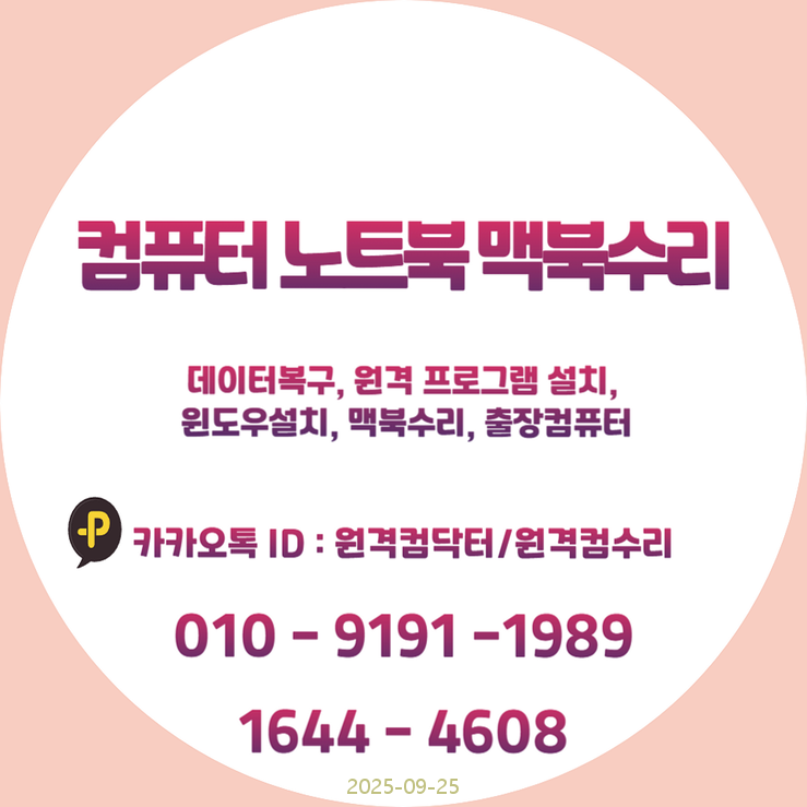 | 군포시 컴퓨터수리 노트북수리: 느려진 컴퓨터 빠르게! 맥북 윈도우 설치부터 원격 프로그램설치까지 완벽하게! (0) | 2025.09.25 |
