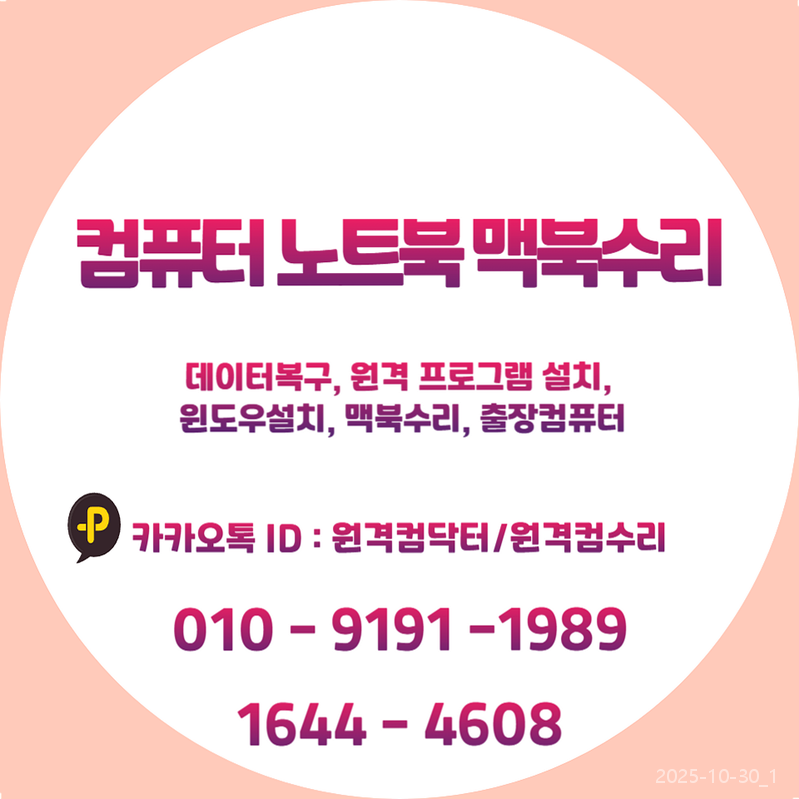 | 🚨파주시 컴퓨터 노트북수리 윈도우설치, 아이맥수리점부터 원격 프로그램설치까지! 급할수록 실력 있는 전문가를 찾아야 하는 이유! (0) | 2025.10.29 |