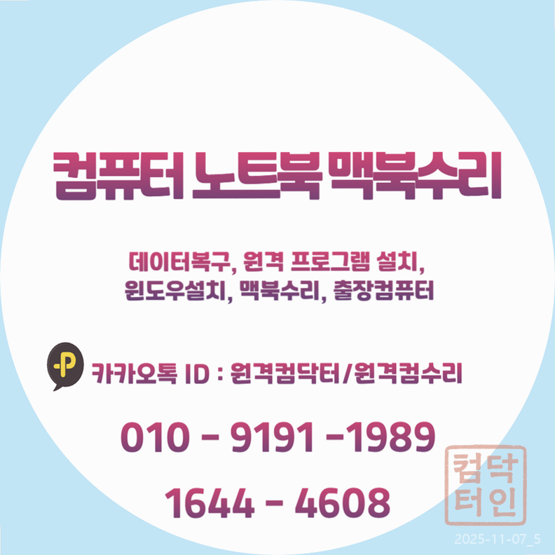 | 오정구 컴퓨터 노트북수리 윈도우설치, 급할 땐 PC출장수리 & 원격 프로그램설치로 한 번에 해결! 💻✨ (0) | 2025.11.10 |