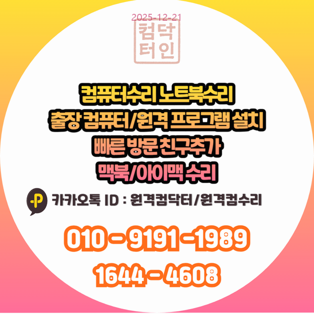 - 카카오톡 문의: 카카오채널 ID '원격컴수리' 또는 '원격컴닥터' 검색 후 문의